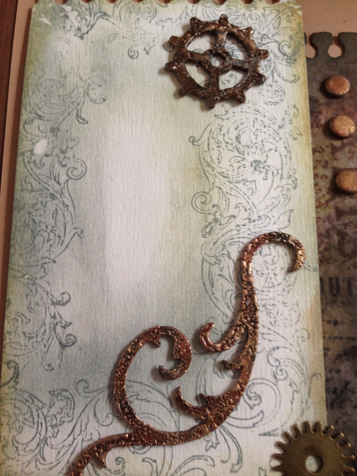 I stamped the flourish from Tim Holtz plate in iced spruce distress ink.